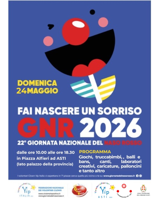 Domenica 24 Maggio 2026 ad Asti in Piazza Alfieri (zona pedonale - lato palazzo della provincia), dalle ore 10.00 alle 18.30 festeggeremo la nostra Giornata del Naso Rosso!!